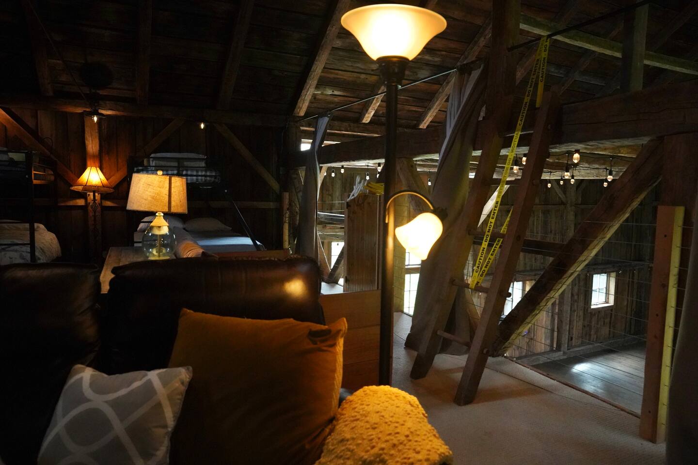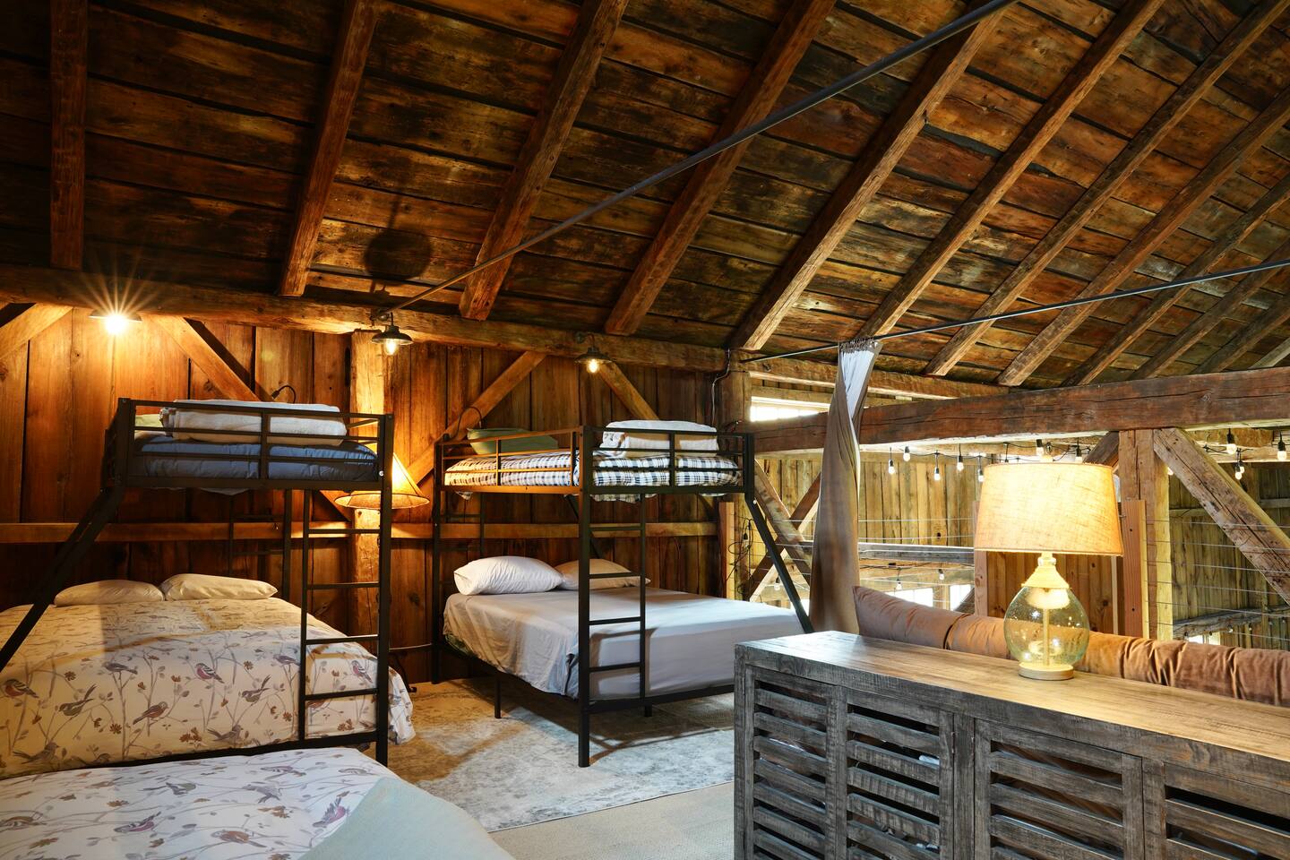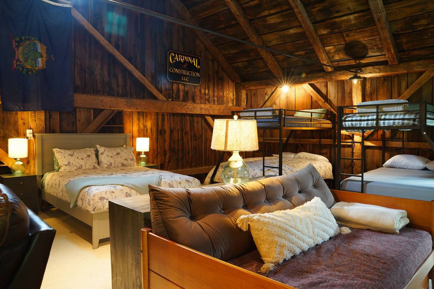 Presenting the Vermont farm experience without compromising on your comfort. Established in 1808, fully modernized + updated with new bunk beds (queen/twin xl), 85" smart TV, new organic cotton bedding and towels. Views from the Loft overlooking the beautiful event space. Gather with your group for popcorn + a movie after a long day, enjoy a hike through the pasture to reconnect with yourself. Large commercial kitchen with ample space to craft meals and dine together. Men's and Ladies' rooms are positioned side by side; find bath essentials in the Men’s room shower. Sleeping arrangements for 8 guests are as follows: 2 twin trundle beds (4 mattresses) 2 twin XL beds (upper bunks) 2 queen beds (lower bunks) 1 queen bed (standalone) Riverledge Farm is proud to offer a strong WiFi signal on the property for your entertainment and ever connectedness. While the cell service in Grafton village is weak at best, we suggest taking this rare opportunity to unplug and find an easy rhythm. Enjoy life as it once was- simple. We welcome everyone, yet a special invitation is extended to those wishing to enter into the slow pace of farm living. While you plan your trip, don’t forget to add this listing to your wishlist!